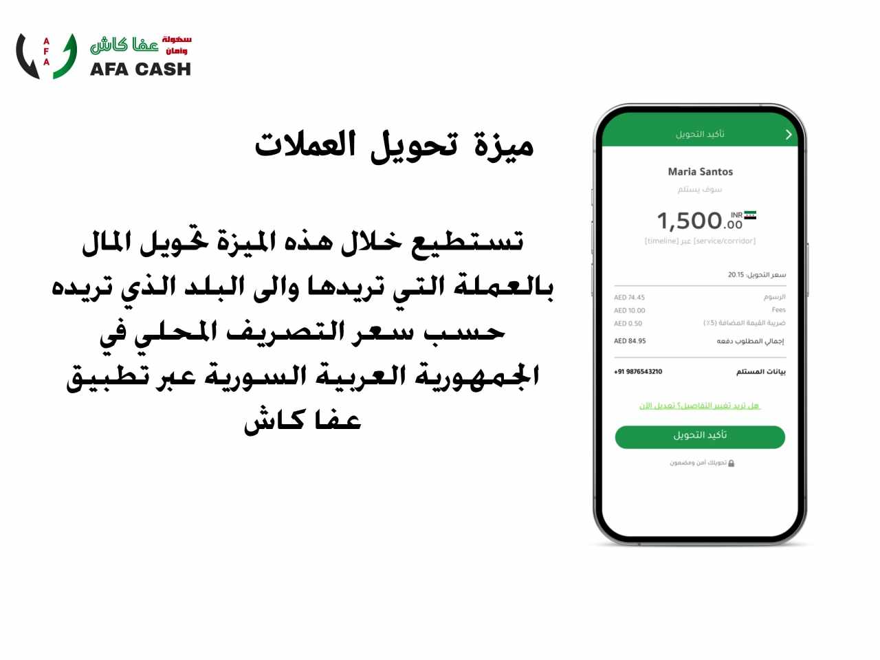 تستطيع خلال هذه الميزة تحويل المال بالعملة التي تريدها والى البلد الذي تريده حسب سعر التصريف المحلي في الجمهورية العربية السورية عبر تطبيق عفا كاش