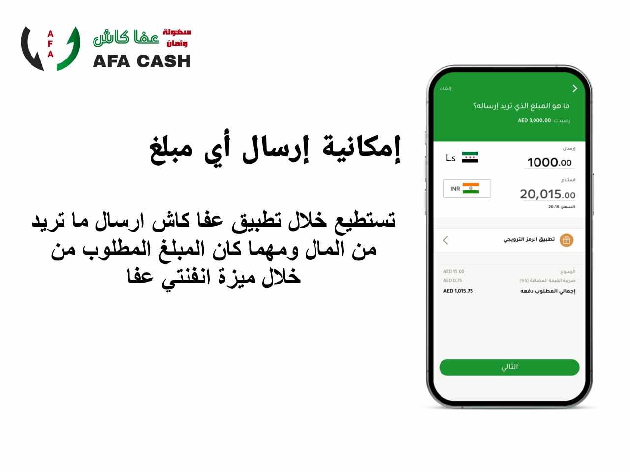 تستطيع خلال تطبيق عفا كاش ارسال ما تريد من المال ومهما كان المبلغ المطلوب من خلال ميزة انفنتي عفا
