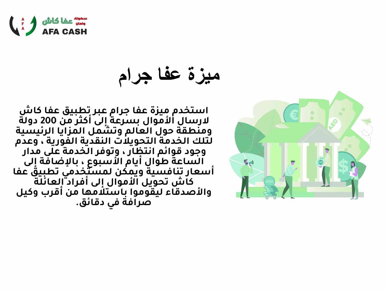 استخدم خدمة عفا جرام عبر موقع عفا كاش لارسال الأموال بسرعة إلى أكثر من 200 دولة ومنطقة حول العالم وتشمل المزايا الرئيسية لتلك الخدمة التحويلات النقدية الفورية ، وعدم وجود قوائم انتظار ، وتوفر الخدمة على مدار الساعة طوال أيام الأسبوع ، بالإضافة إلى أسعار تنافسية ويمكن لمستخدمي موقع عفا كاش تحويل الأموال إلى أفراد العائلة والأصدقاء ليقوموا باستلامها من أقرب وكيل صرافة في دقائق.